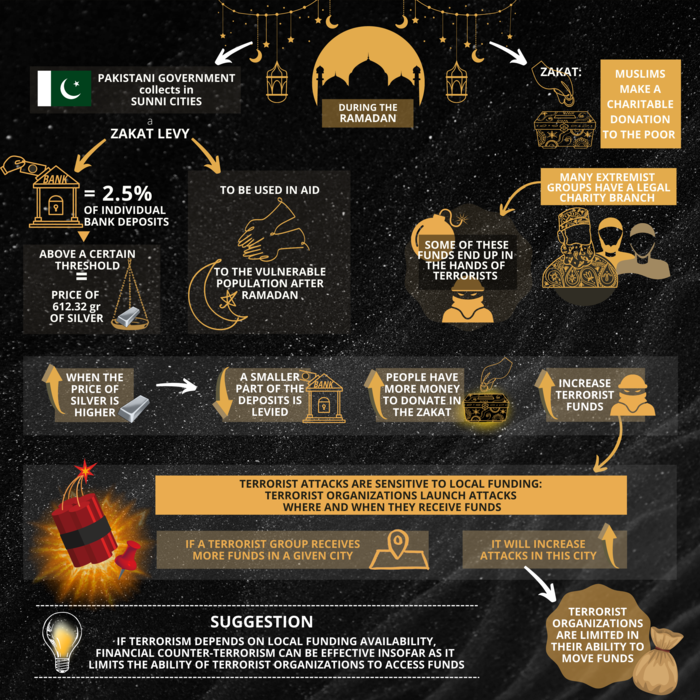 In the same period, the Pakistani government collects, from Sunni Muslims, a Zakat levy (to be used in aid to the vulnerable population after Ramadan) equal to 2.5% of individual bank deposits above a certain threshold. Such a threshold corresponds to the price of 612.32 grams of silver. Therefore, when the price of silver is higher, a smaller part of the deposits is levied, and people have more money to donate in the Zakat. Indeed, Limodio finds that a higher price of silver leads to more donations. Thus, changes in the price of silver affect how much funding goes to terrorist organizations and allows us to observe how funding affects the decisions of terrorist groups to launch attacks.