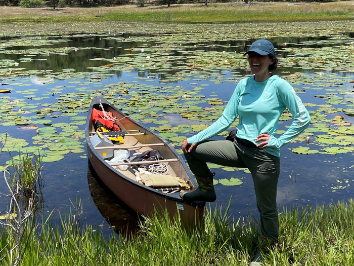 Goeckner took two canoes (attached to each other) into the ponds. She and a lab technician each sat in one canoe to balance the weight. Goeckner then collected muck from the bottom of the ponds and measured the depth of muck above a sandy layer of sediment, indicating when the pond was constructed and the amount of organic carbon stored in it.