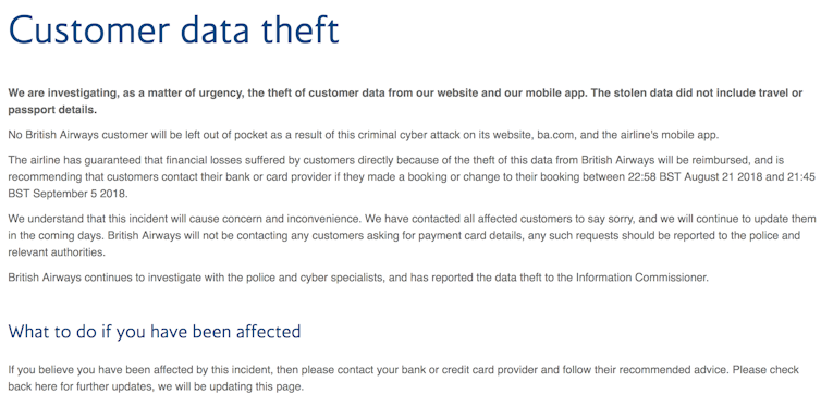 When the hack was finally discovered, BA didn’t initially provide enough coherent and robust information on the actual scope of the data taken. The company’s main statement about the hack defined the data that was not included – passport and travel details – but didn’t spell out that bank card details were involved, instead advising customers to contact their banks. This seems like trying to put a positive spin on very bad news, and means that the potential theft of what customers are most worried about – their card details – was not highlighted.