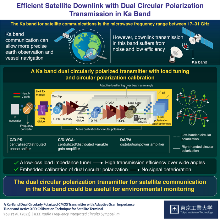 Against this backdrop, researchers from Tokyo Institute of Technology (Tokyo Tech), Japan have now proposed, in a new study, what is the first reported dual circular polarization transmitter for satellites in the Ka band based on a standard silicon CMOS process. Their work was presented in the IEEE Radio Frequency Integrated Circuits Symposium and published in the conference proceedings. “In our study, we were able to lower the losses and increase the transmission efficiency by using an adaptive impedance tuning circuitry, realized with a low-loss pi-type transformer-based load tuner. With this innovation, a satellite will be able to transmit to a receiver on earth for a wide range of angles,” explains Associate Professor Atsushi Shirane, one of the authors in the study.