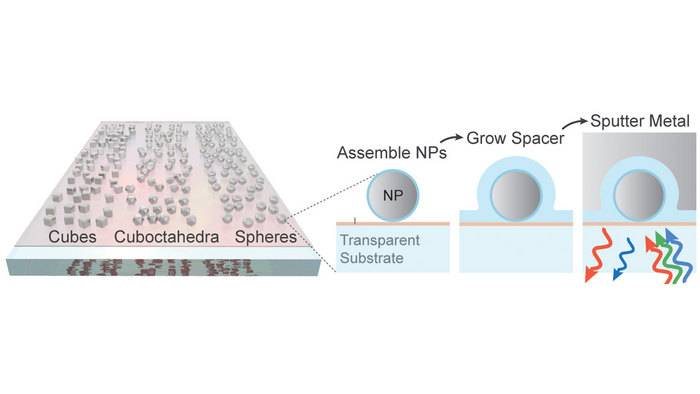 These so-called plasmonic metasurfaces consist of three layers — a metal base coated in a nanometer-thin transparent substrate topped with silver nanocubes. While this configuration has worked well for laboratory demonstrations, it leaves little room for creativity. Because an area of the nanoparticle must be within a few nanometers of the metal surface below, researchers couldn’t use a wide variety of shapes.