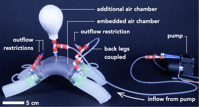The ultimate dream of soft robot designers is a robot that not just moves, but also responds to its environment. Van Laake: ‘Ultimately, you want a robot that automatically changes its gait if it encounters an obstacle just because the muscles and joints respond to the change in pressure.’